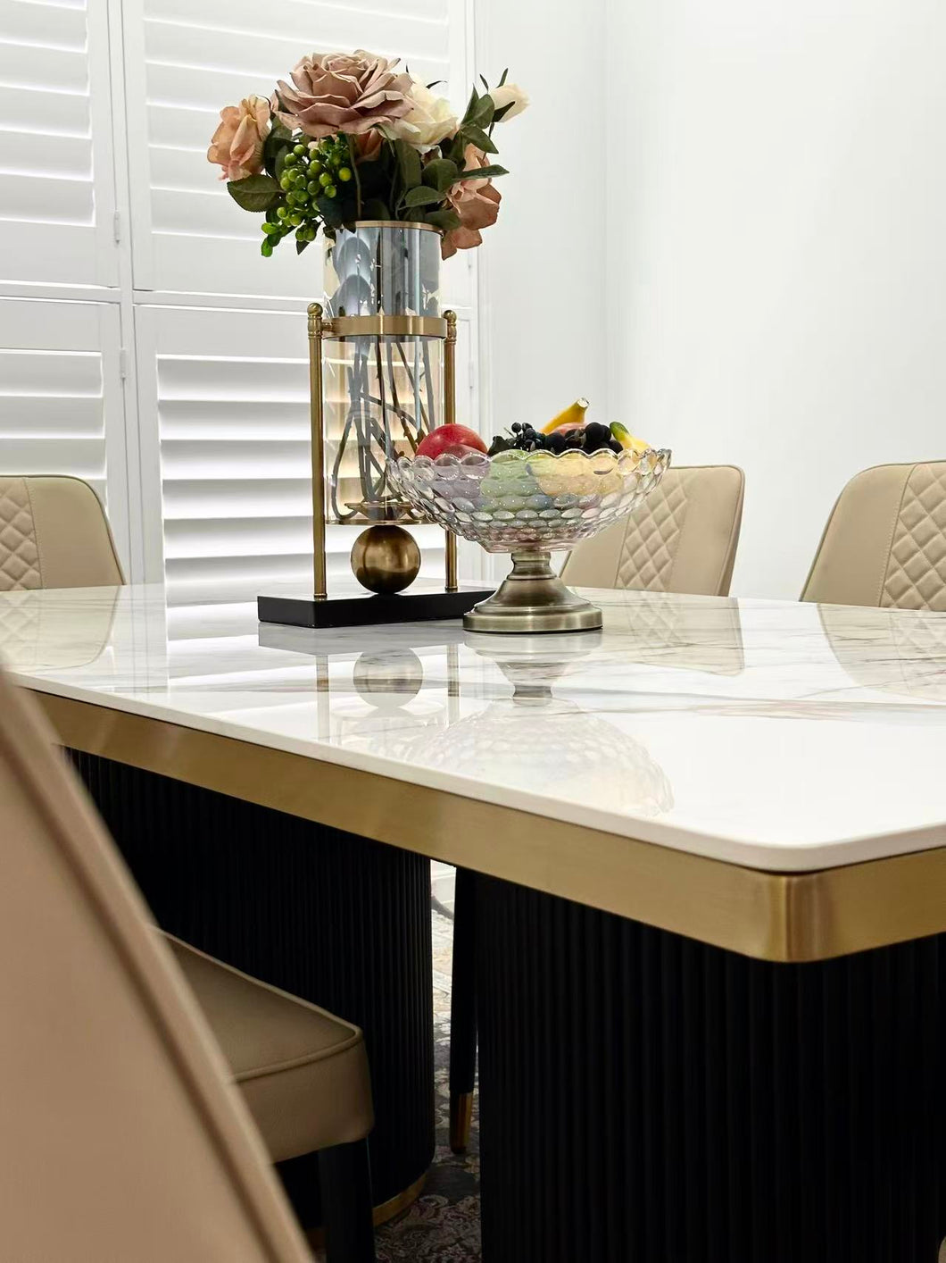 Experience the perfect harmony of luxury and durability with our Golden Stainless Steel Black Wood Full Cylinder Dining Table. Featuring a premium sintered stone tabletop, this piece combines the timeless elegance of black wood with the sleek, modern appeal of golden stainless steel accents.